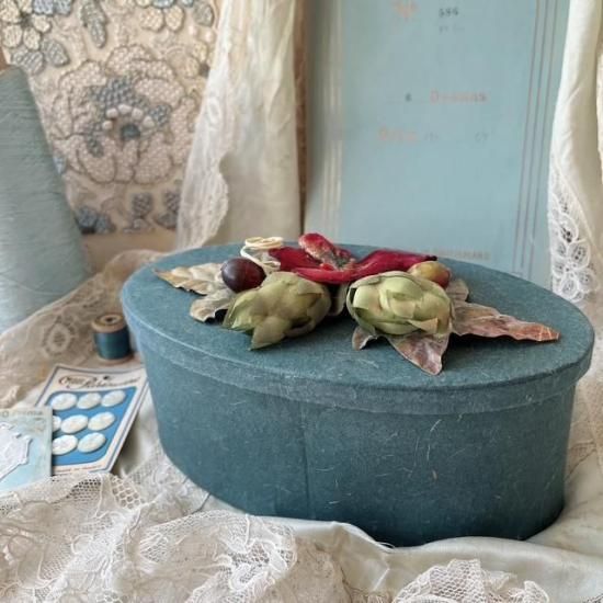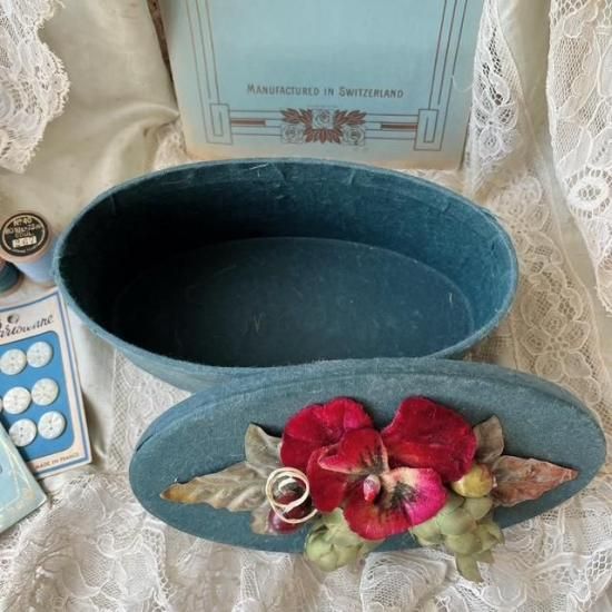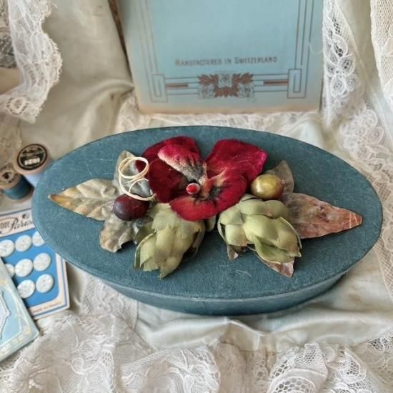 (size 10×19×9.5cm) スイスの蚤の市で見つけてきました、お花の付いたブルーの箱です。クラシカルなお花や実や葉っぱの付いた、深いブルーのオーバル型の箱です。年月を経たものの為、古びた風合いをしております。メルスリーは含まれません。ご了承下さい。配送方法は、宅急便になります。