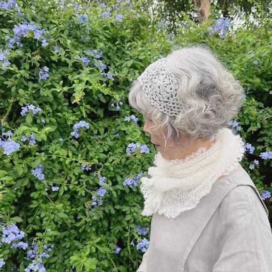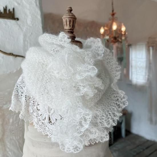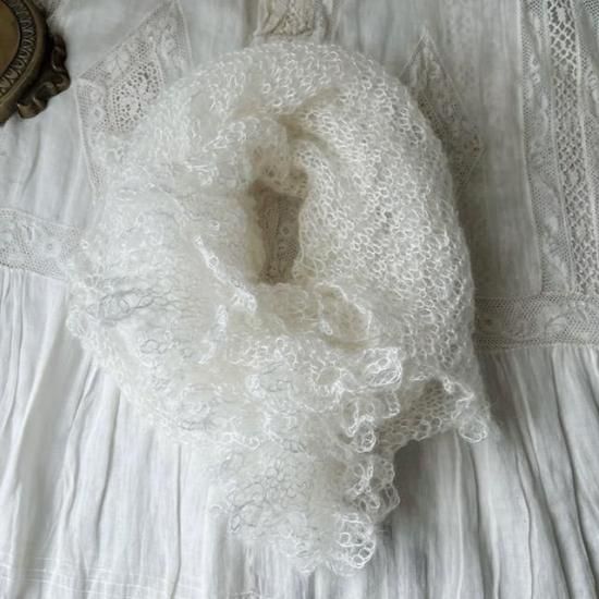 mituskoの手編みのホワイトモヘアのスヌードです。ふわふわしたフリル編みの、軽くて温かいスヌードです。配送方法は、宅急便になります。